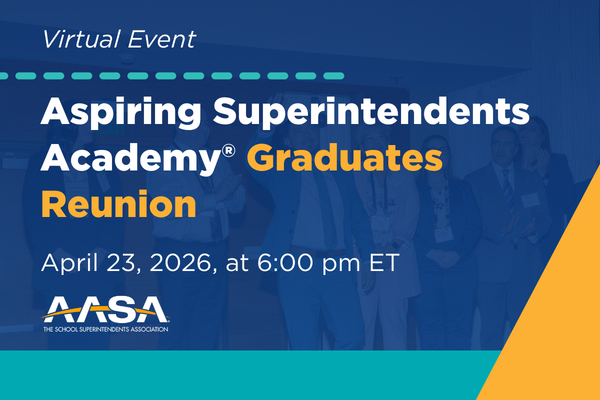 Aspiring Superintendents Academy® Graduates ReunionType:Webinar Topics: Leadership DevelopmentThis one-hour virtual gathering will be a meaningful opportunity to reconnect, learn, and strengthen the network that continues to shape educational leadership across the nation. -