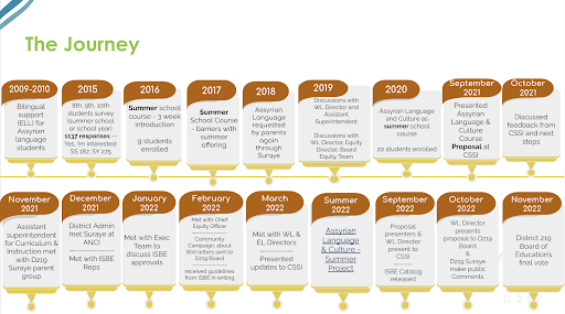A petition was launched for an Assyrian language course which gained nearly 700 signatures, prompting a district-wide survey. Results showed strong interest, with 187 students interested in a summer class and 275 interested in a year-long course.